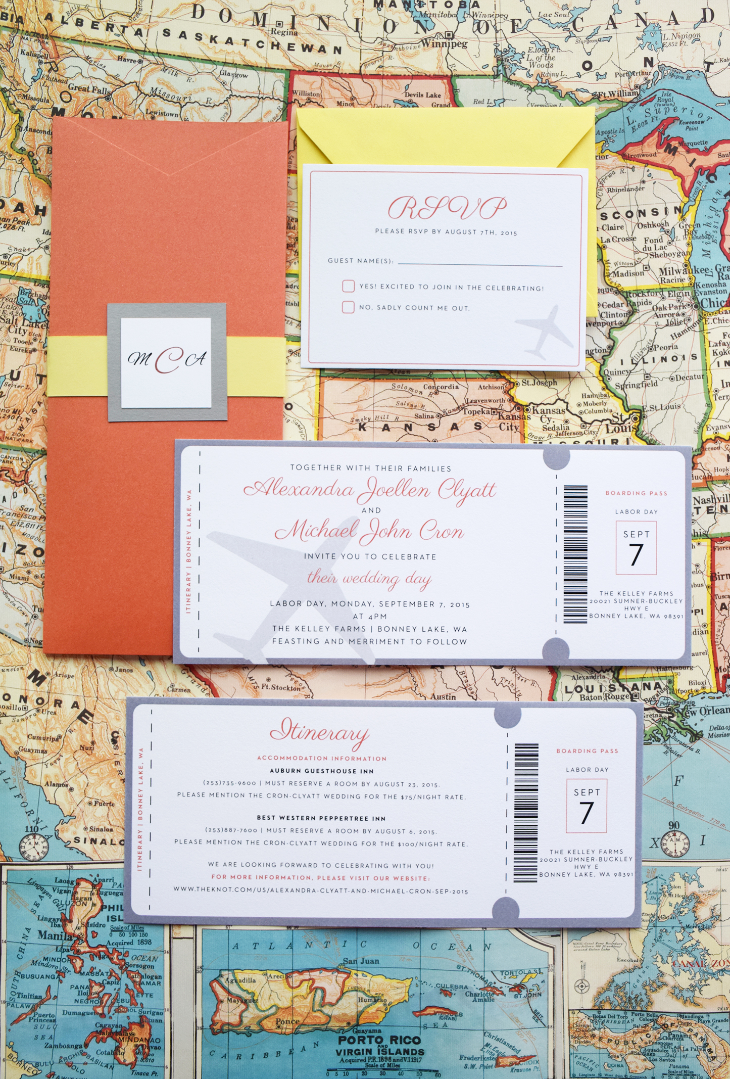Having a destination wedding? Play off of the travel theme and get your guests excited for the trip! Go retro and include your “boarding pass” invitation, info card-turned-travel-itinerary and RSVP “receipt” in a sleeve that has your wedding logo as the “airline” logo! Fun, right?